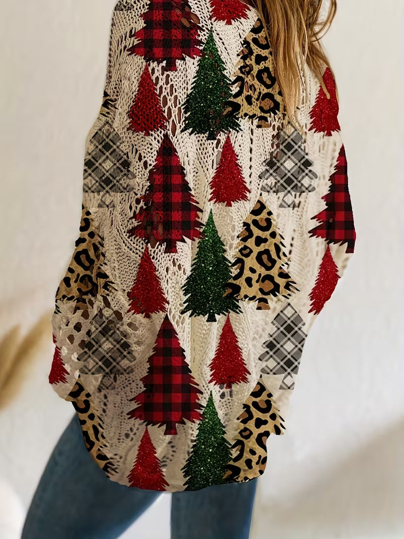 Women Long-Sleeve Christmas Tree Print Knit Pullover – Casual & Elegant Loose Fit Sweater